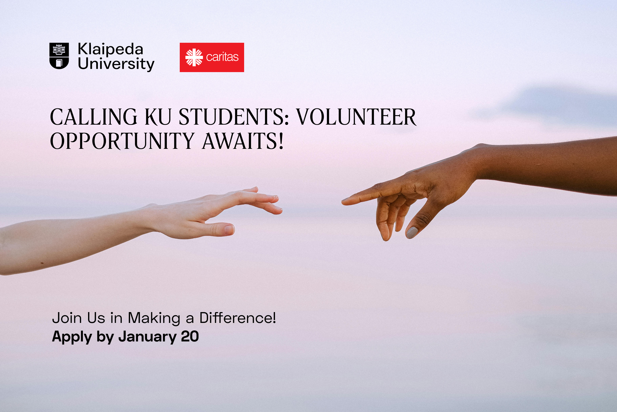 After being selected as a volunteer and committing to at least 24 hours of volunteering per month, you will be eligible to apply for monthly Klaipeda University scholarships, awarded from February 1, 2026, to May 31, 2026.