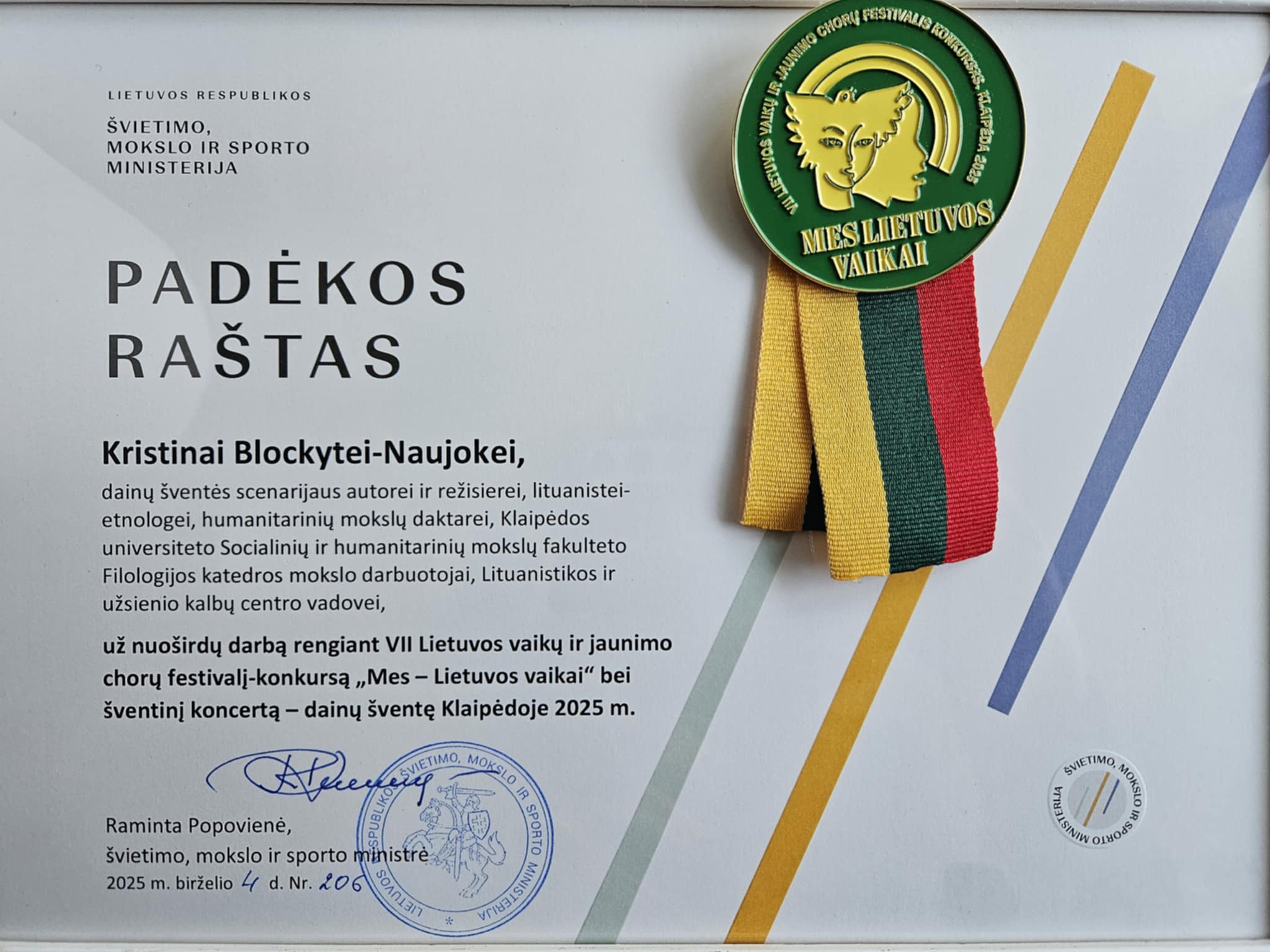 Už nuoširdų darbą rengiant VII Lietuvos vaikų ir jaunimo chorų festivalį-konkursą „Mes – Lietuvos vaikai“ bei šventinį koncertą – Dainų šventę, festivalio meno vadovui prof. Algirdui Šumskiui ir režisierei dr. Kristinai Blockytei-Naujokė įteikti Lietuvos Respublikos švietimo, mokslo ir sporto ministrės Ramintos Popovienės padėkos raštai.