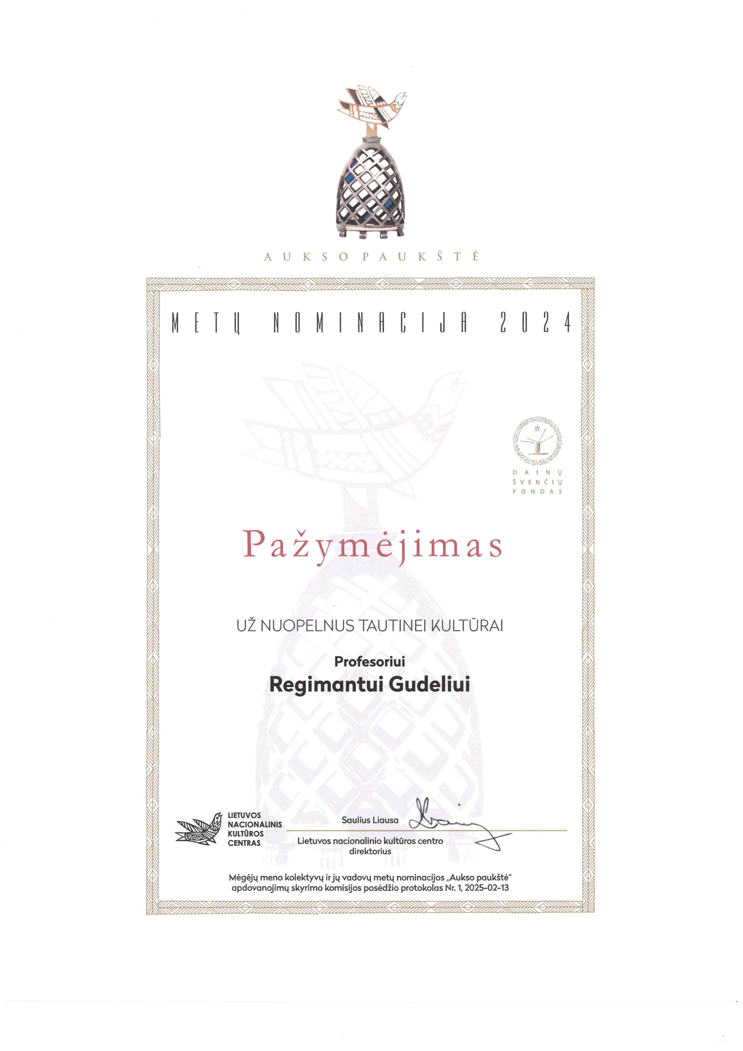 Šventės metu už nuopelnus tautinei kultūrai buvo pagerbtas Klaipėdos universiteto ilgametis pedagogas, dirigentas ir mokslininkas prof. dr. Regimantas Gudelis – jam įteikta „Aukso paukštės“ nominacija.